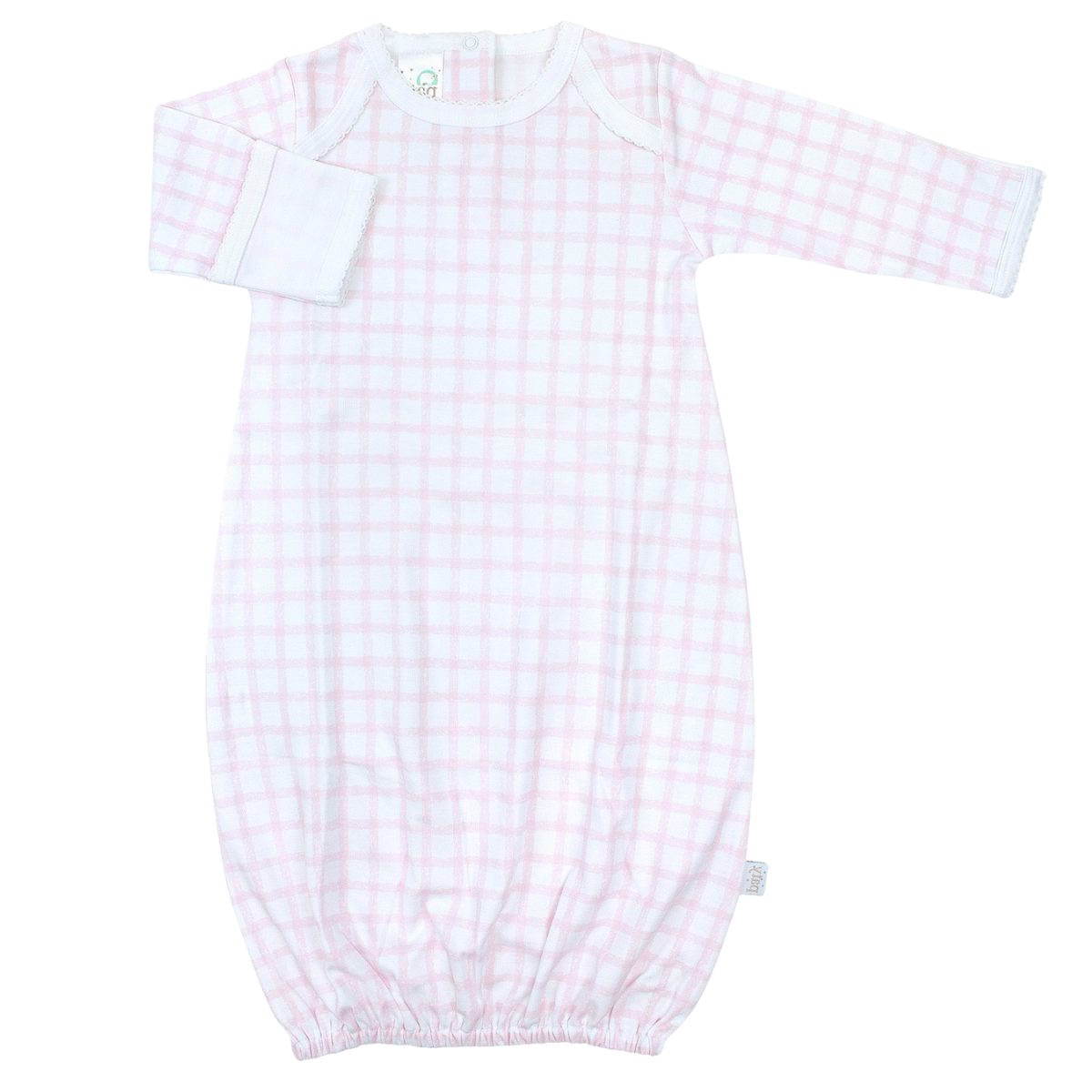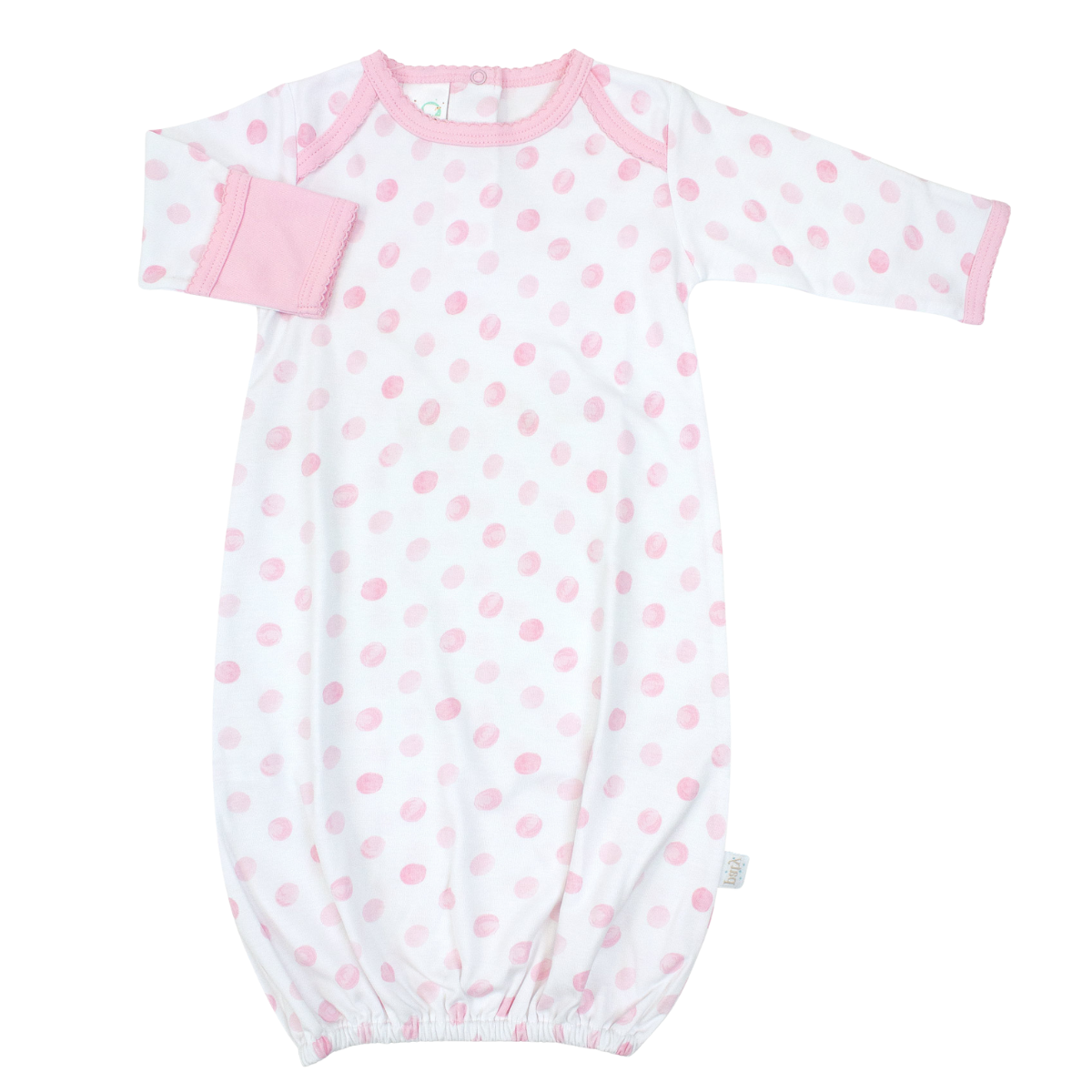 A best selling take-home outfit. This gown includes a convenient elastic bottom for easy diaper changes, making it a favorite for newborns. An overlap shoulder design ensures gentle dressing, providing a cozy fit without disturbing your little one. This particular knit style runs true to size. Available in preemie, newborn, 3M, 6M sizes.