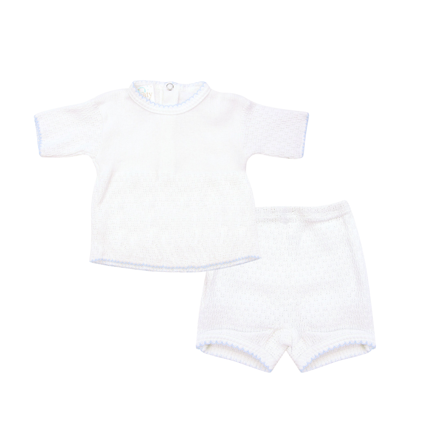 Discover our Paty Knit Short Set at Paty. This coordinated baby set features our soft signature knit top paired with matching knit shorts for a classic, timeless look. Comfortable and lightweight, it’s perfect for everyday wear, baby gifts, and special occasions. Order today! Made in the USA. Product Style #130.