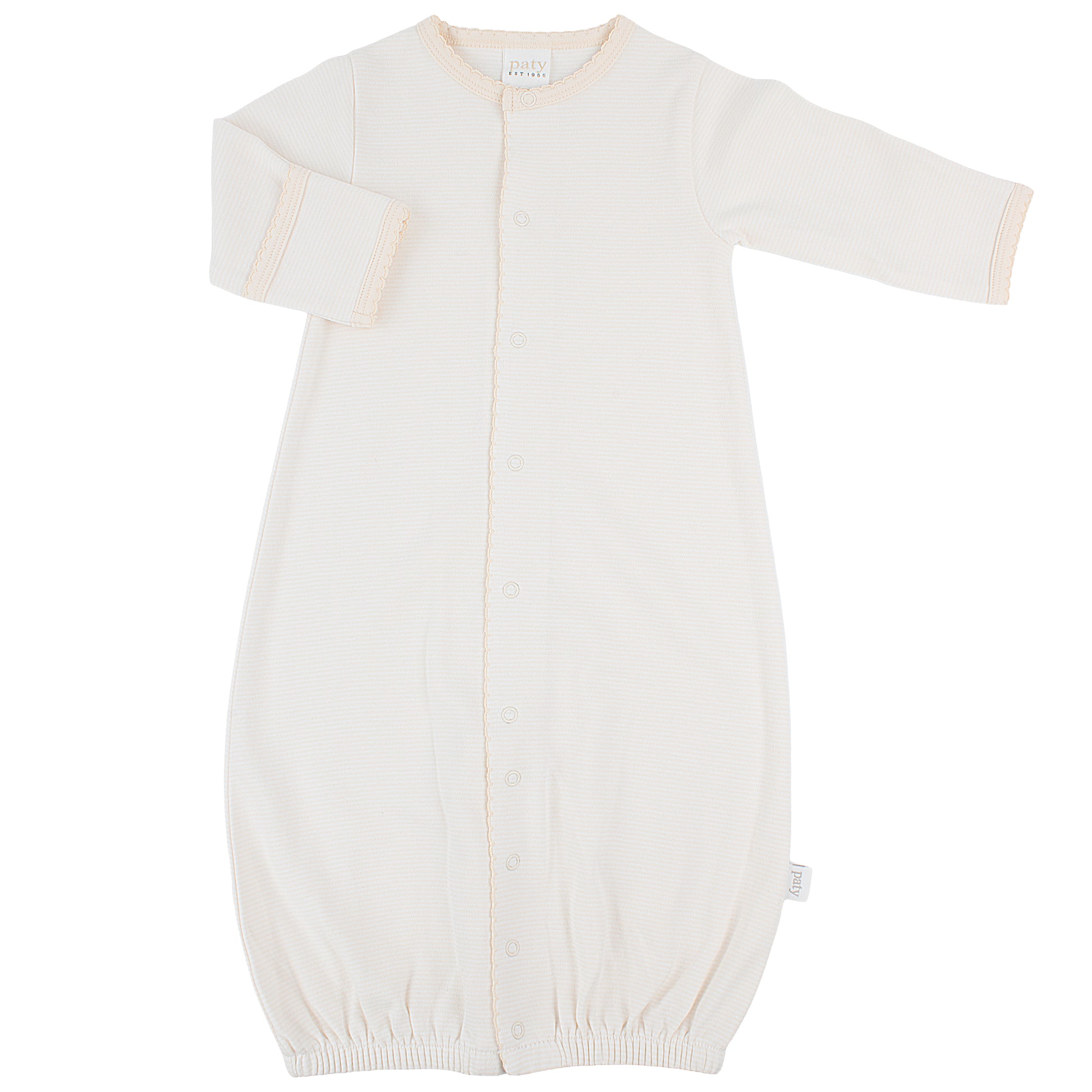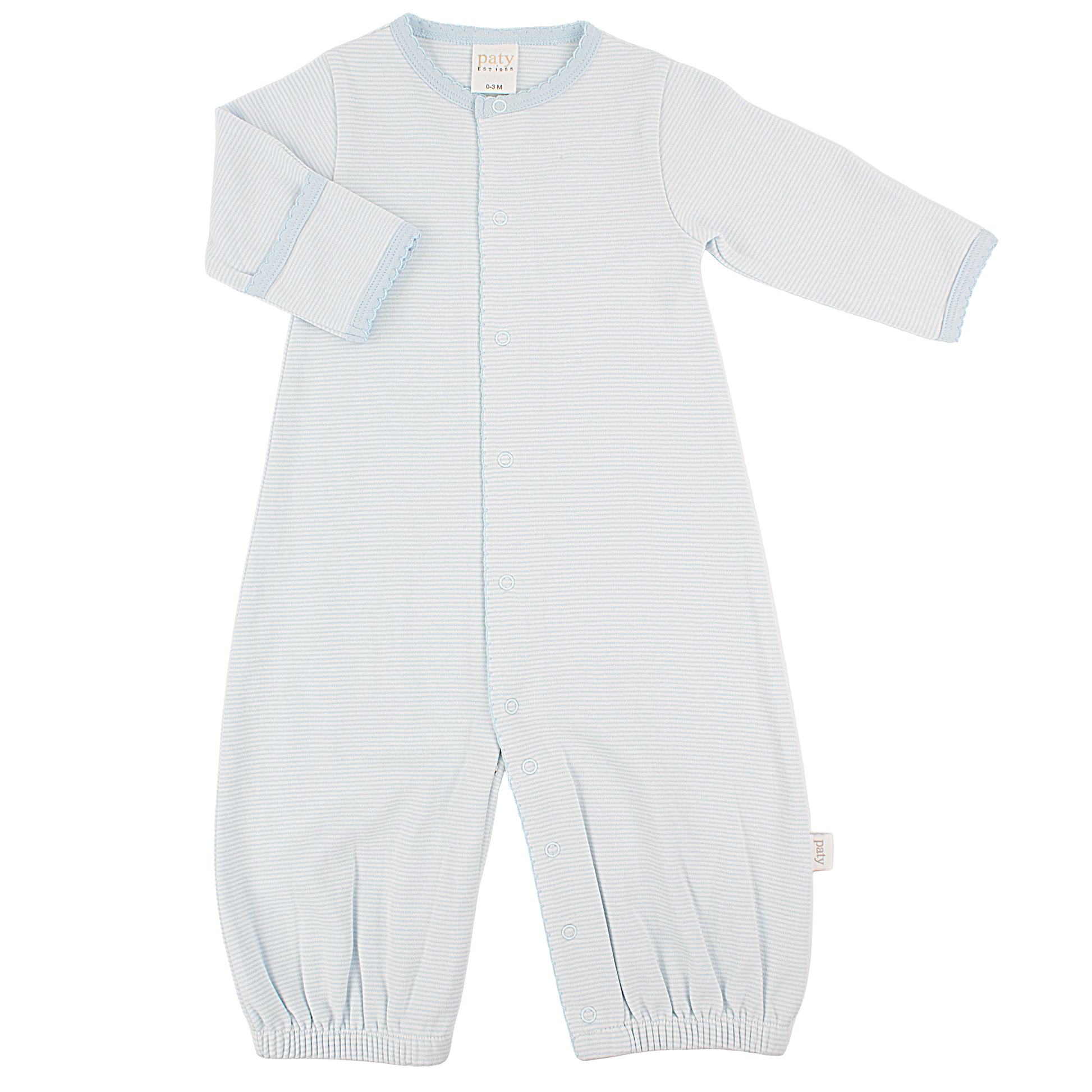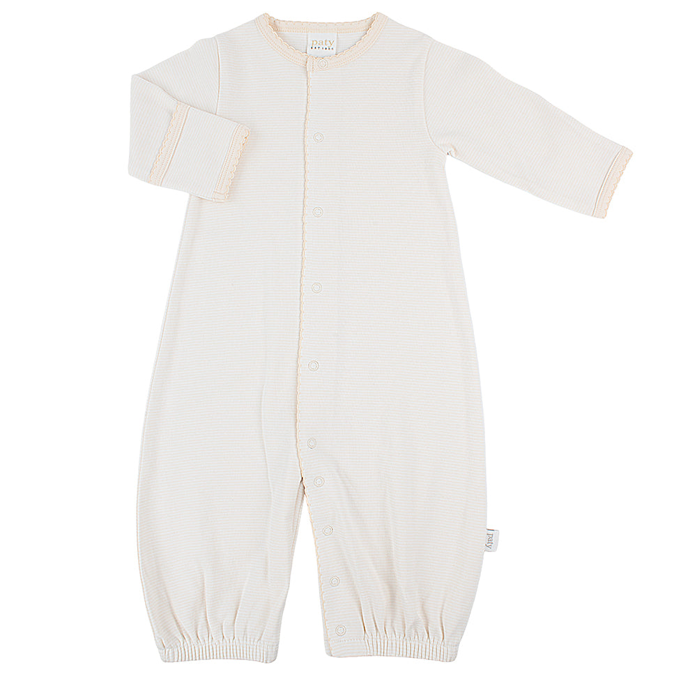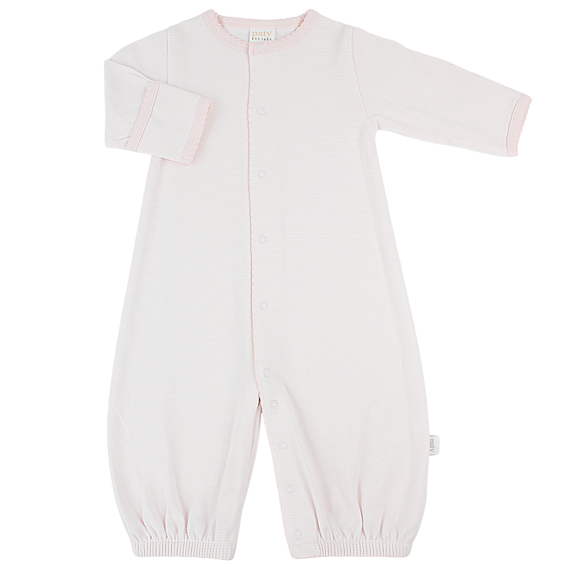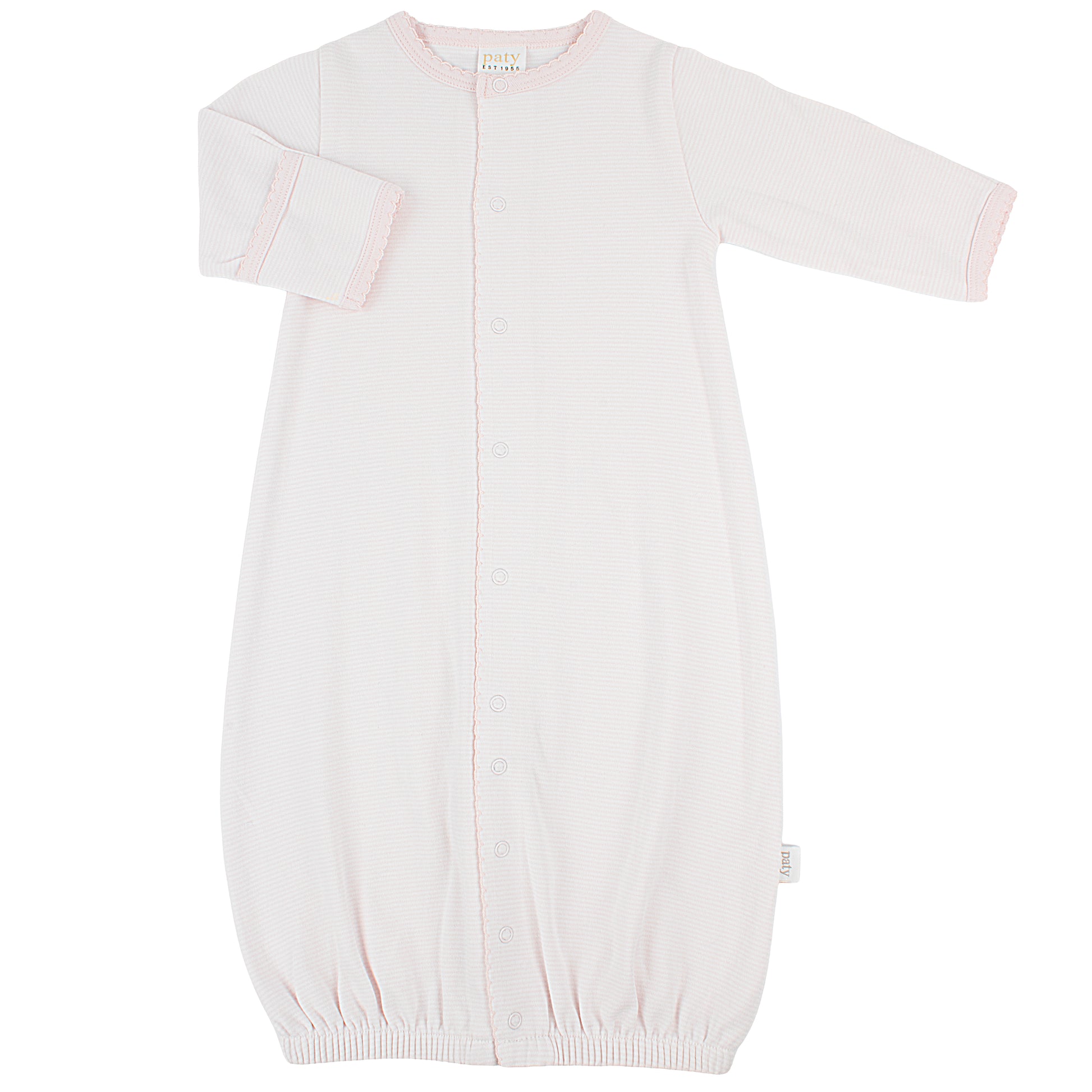 A Paty favorite! Our interlock striped converter gown converts from a gown into a romper. It also includes a convenient elastic bottom when used as a gown which makes for easy diaper changes. It's the perfect take home outfit for newborns. The design includes snaps when using as a romper style and ensures gentle dressing and provides a cozy, soft fit. This particular knit style runs true to size. Available in newborn and 0-3M sizes.
