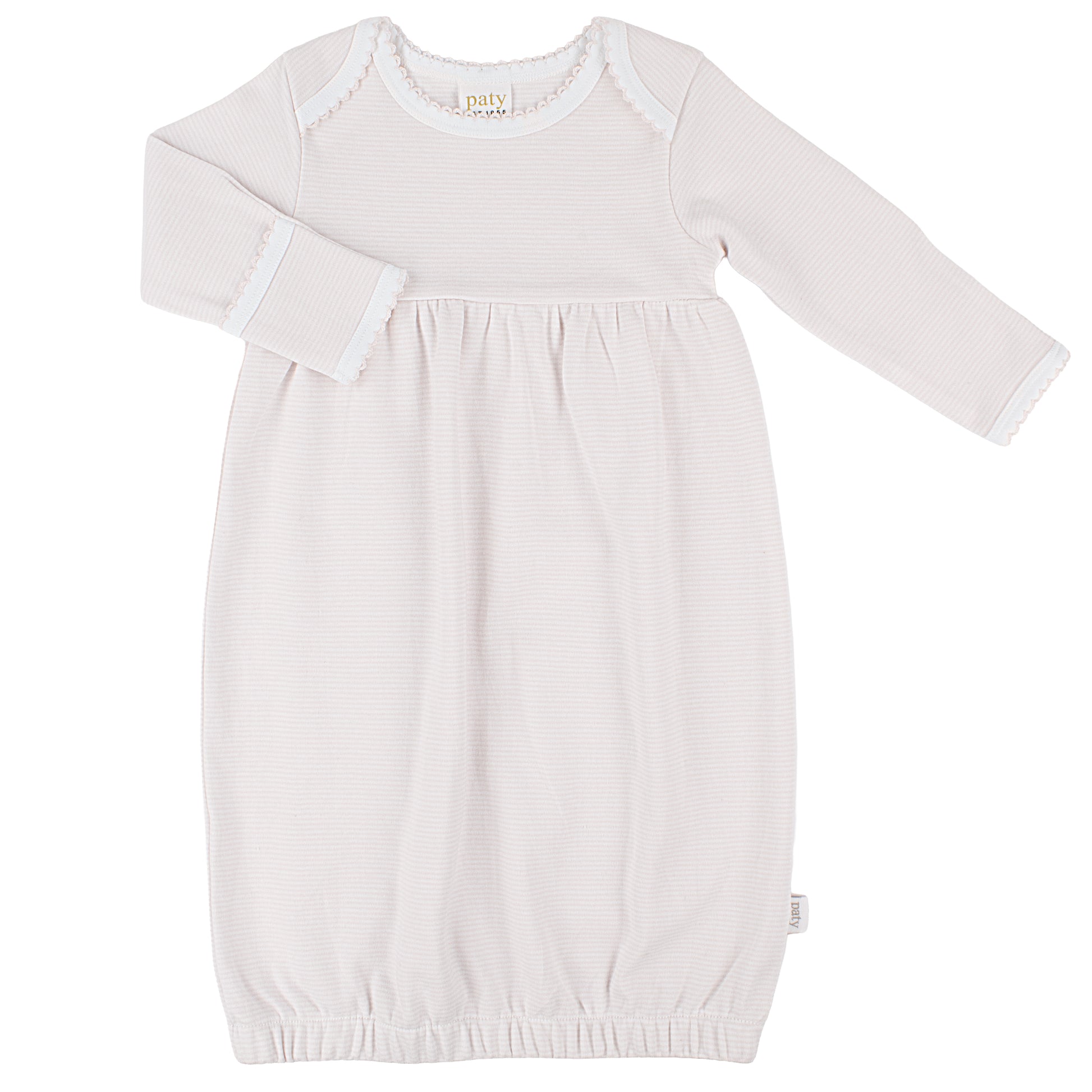 A timeless essential for newborns, this baby gown is crafted from soft, breathable organic cotton interlock fabric for gentle comfort on delicate skin. Designed with convenient overlap shoulders for easy dressing, it features delicate picot trim along the neckline and cuffs for a refined, classic touch. The full-length silhouette with an elasticized hem allows for quick diaper changes while keeping baby cozy and comfortable. Perfect for sleep, lounging, and those earliest days at home. Available in a classic solid with contrast picot trim and a timeless stripe variation, this gown blends everyday ease with heirloom-inspired style. Product Style #GSS2601-PS, #GSS2601-WP.
