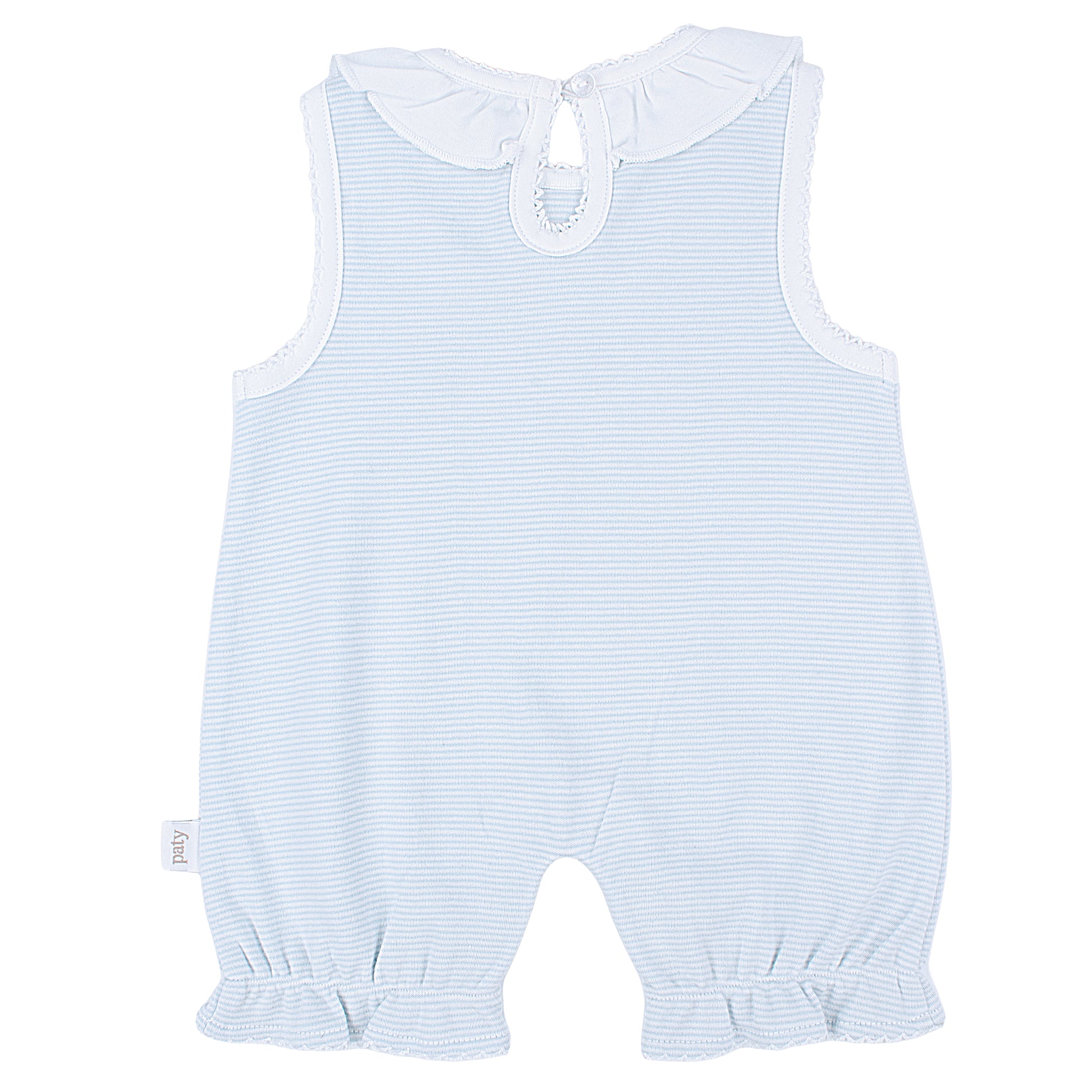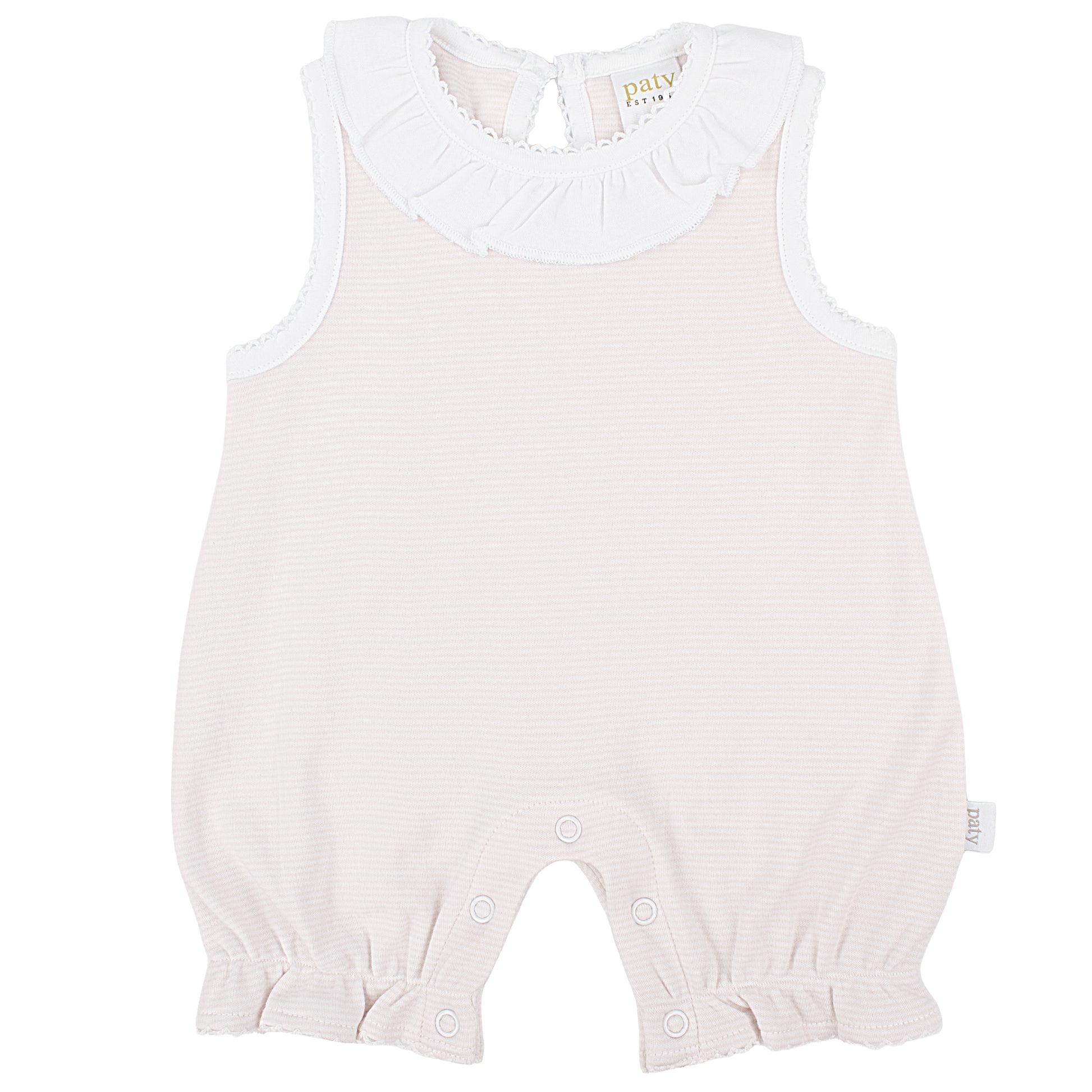 A timeless essential, this baby girl bubble is crafted from soft organic cotton in a classic stripe for a light, breathable feel. The delicate ruffle collar adds a refined, feminine touch, while gentle elastic at the leg openings ensures a comfortable fit. Designed with a back button closure and inseam snaps for easy changes, this sweet style is perfect for everyday wear, special moments, and baby shower gifting. Product Style #GSS2609.