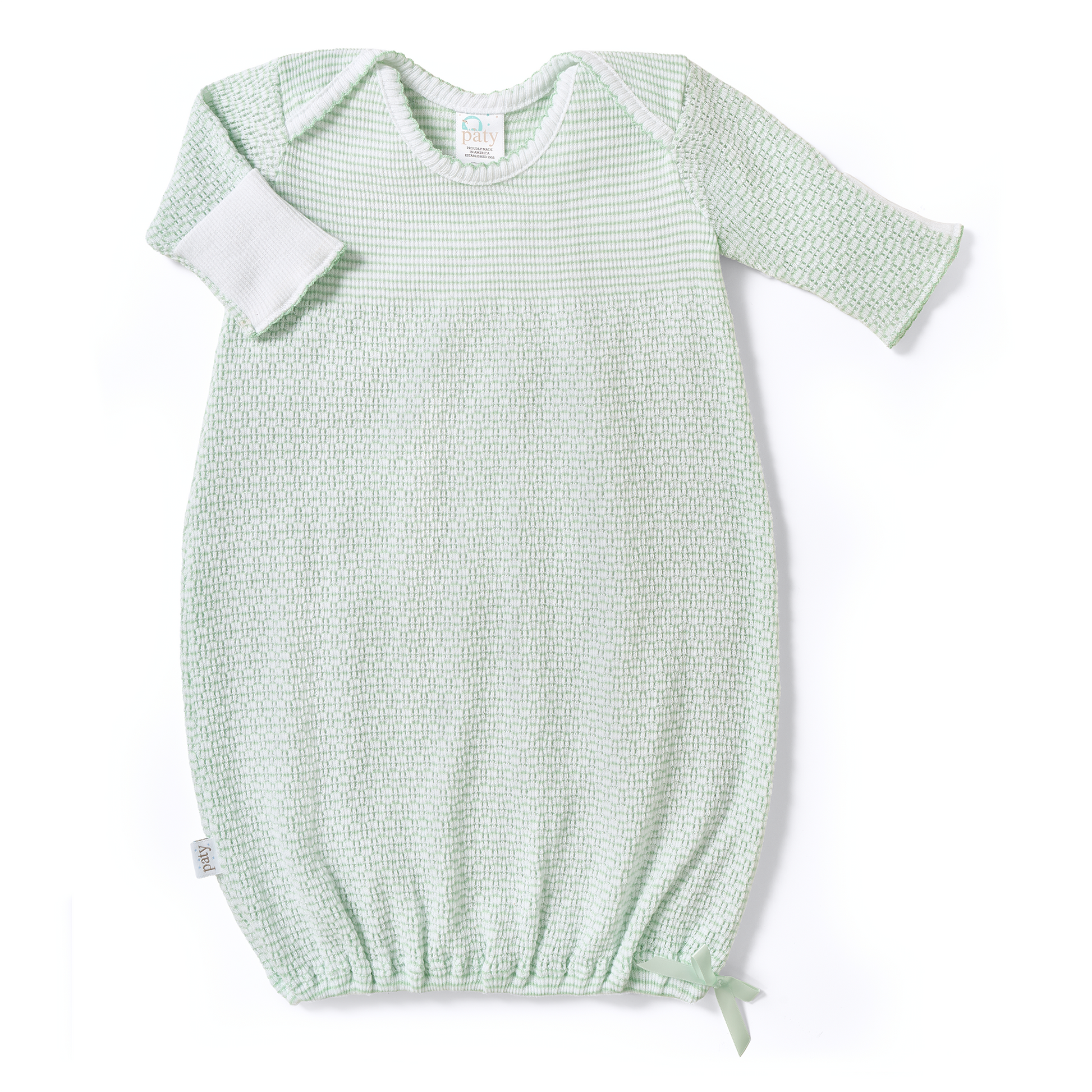 Discover our best selling newborn gown! This gown includes a convenient elasticized hem for easy diaper changes, an overlap shoulder design ensuring gentle dressing and a cozy fit, with built in fold over cuffs at the hands help to protect delicate skin from scratches. This particular knit style runs generously. If between sizes it is recommended to size down. Available in preemie, newborn, & 3M sizes. Made in the USA. Product style #215.