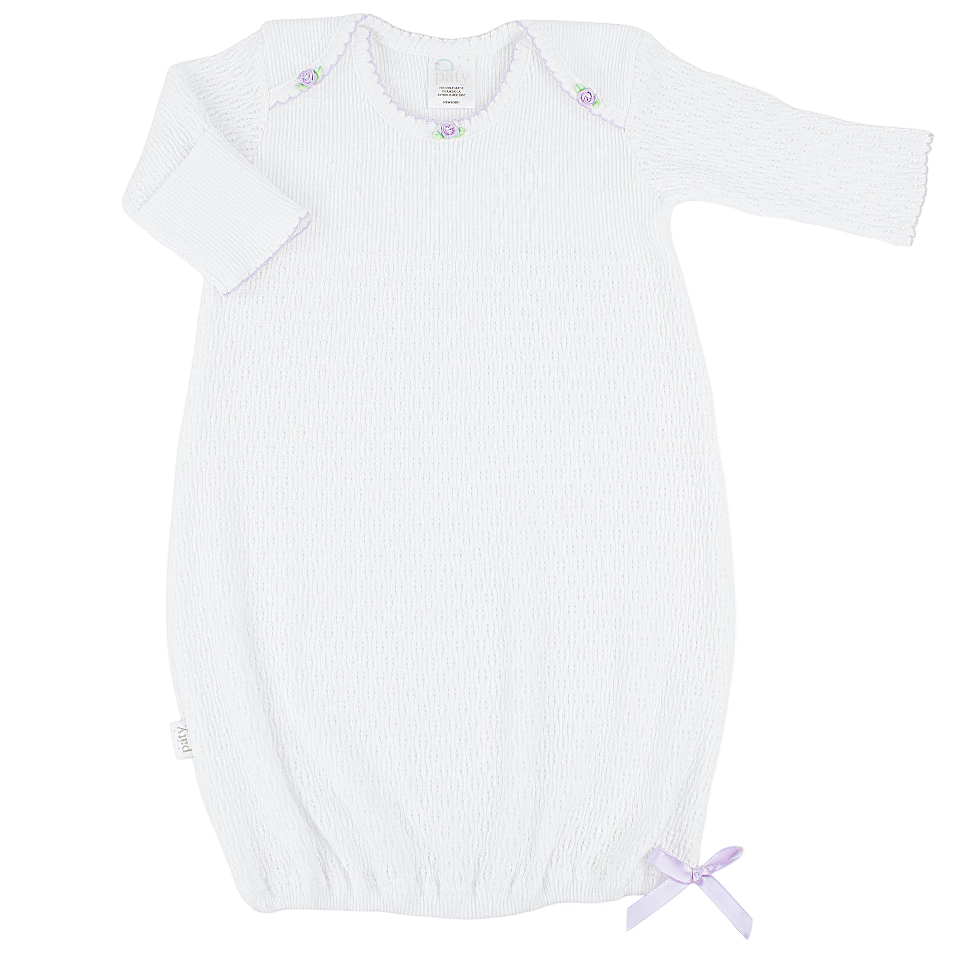 Our best selling take-home outfit with satin rosettes. This gown includes a convenient elastic bottom for easy diaper changes, making it a favorite for newborns. An overlap shoulder design ensures gentle dressing, providing a cozy fit without disturbing your little one. This particular knit style runs generously. Available in Preemie, Newborn, 3M, and 6M sizes.
