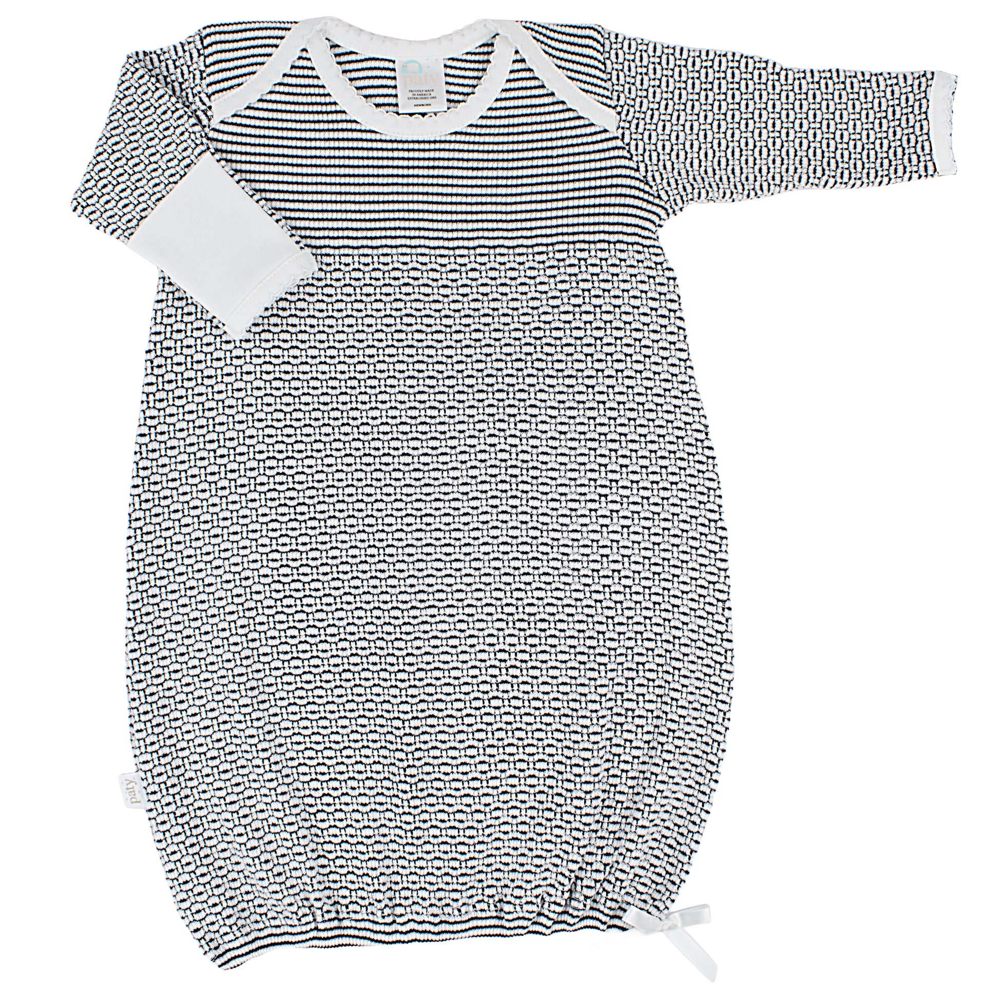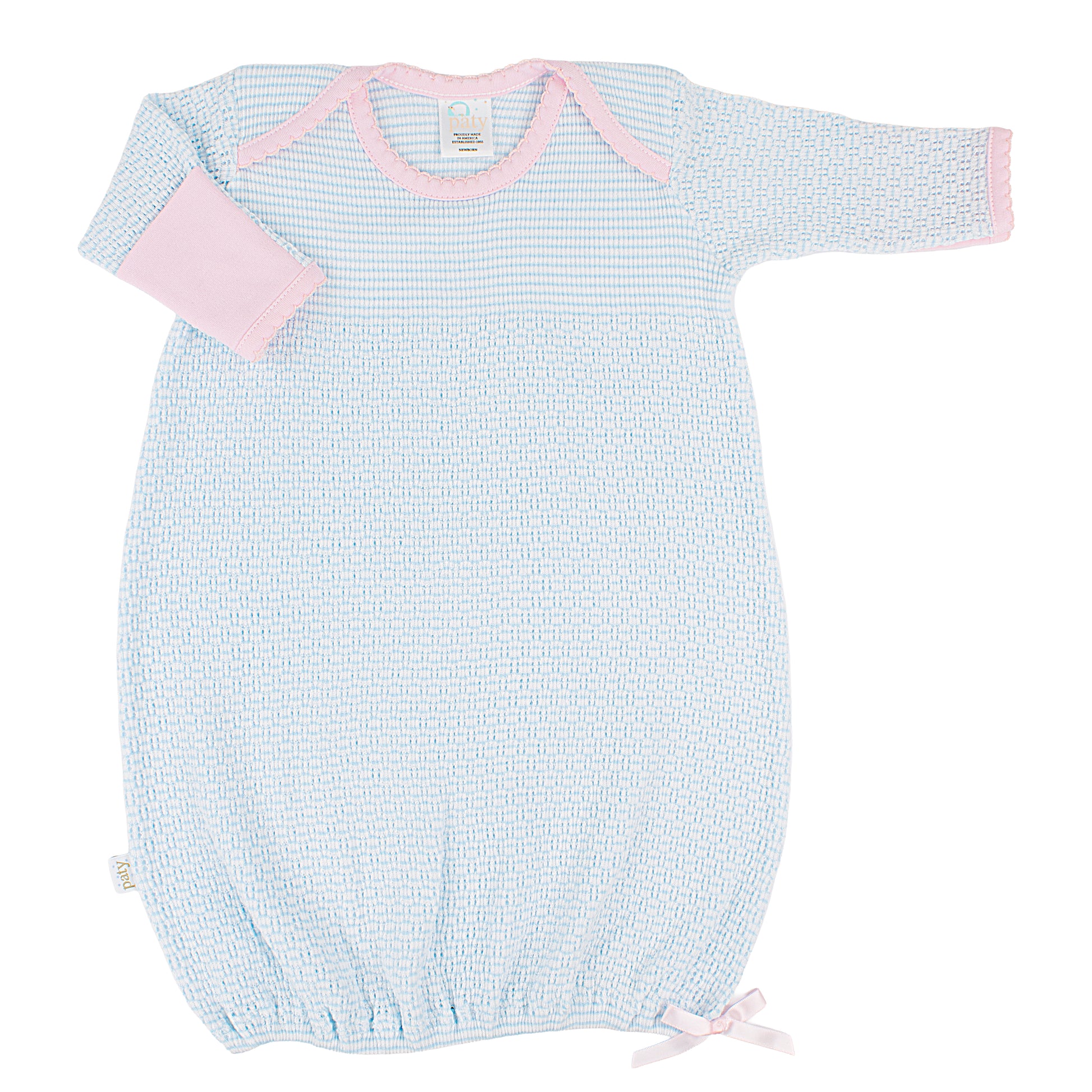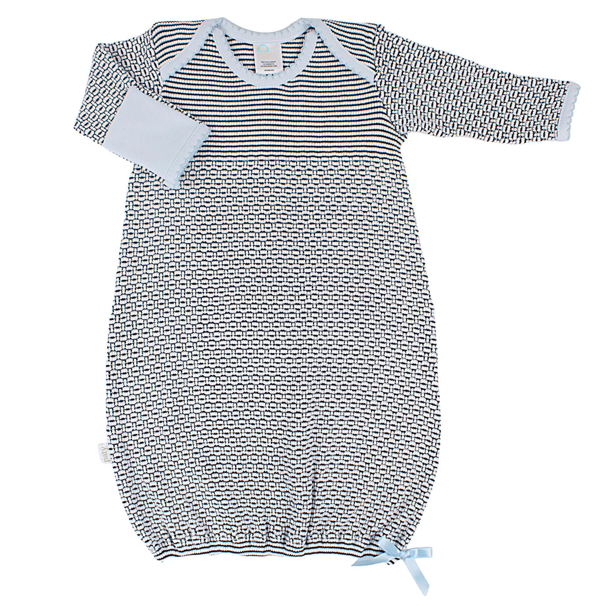 Our best selling take-home outfit with pima trim! This gown includes a convenient elastic bottom for easy diaper changes, making it a favorite for newborns. An overlap shoulder design ensures gentle dressing, providing a cozy fit without disturbing your little one. This particular knit style runs generously. If in between sizes it is recommended to size down. Available in preemie, newborn, 3M, 6M sizes.