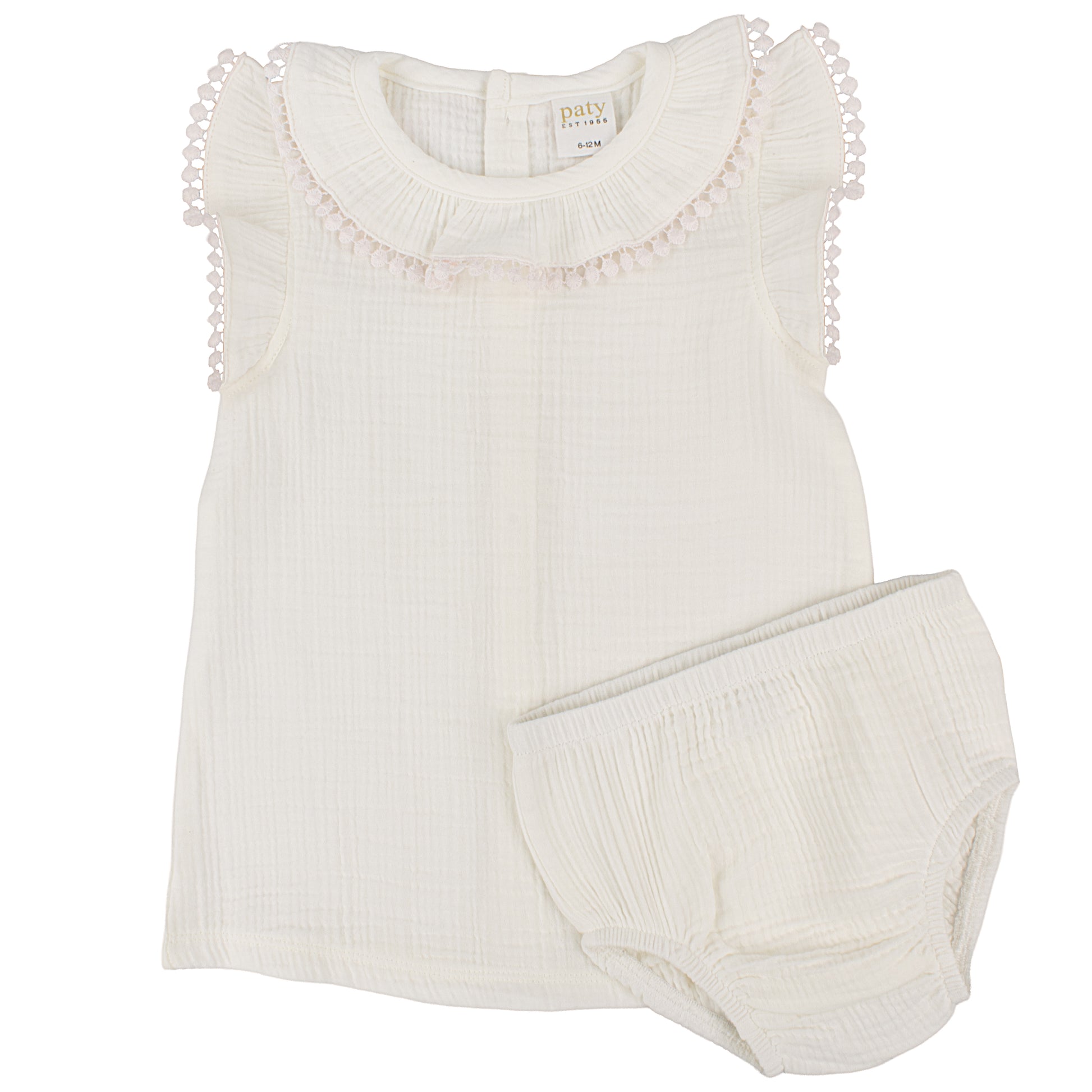 A charming two piece set designed for warm days and special moments. Crafted from soft organic cotton muslin gauze, this baby girl dress features a delicate ruffle collar finished with playful pom trim for a sweet, elevated look. The matching bloomers complete the outfit, offering both comfort and coverage. Lightweight, breathable, and gentle on baby’s skin, this set is perfect for everyday wear, outings, or special occasions. Easy to wear and beautifully detailed, it’s a lovely choice for baby showers, gifting, or a take home layette essential. Product Style #GSS2605.