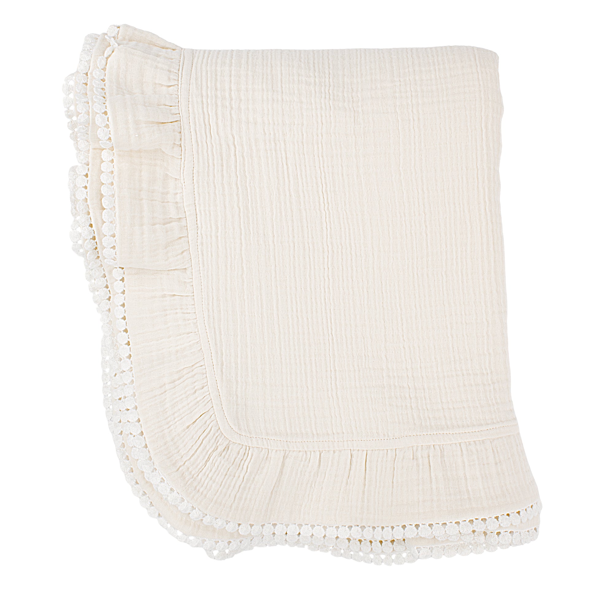 Wrap baby in our Muslin Pom Trim Blanket from Paty. Ultra-soft, cozy baby blanket in premium quality fabric. Perfect for nursery or on-the-go. Order today!