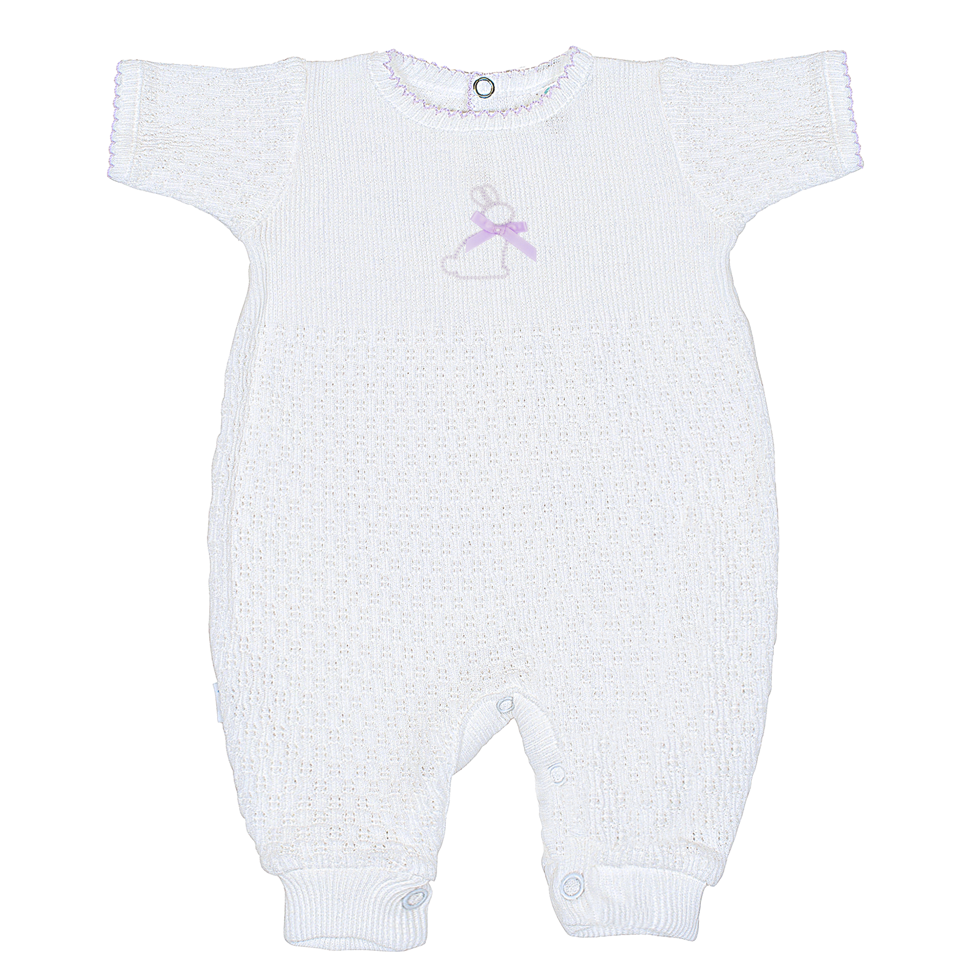 Sweet and timeless, this Paty Knit romper is crafted from our signature soft knit for gentle comfort. A delicate embroidered bunny with a soft satin ribbon adds a charming touch, while subtle picot trim provides a classic finish. Designed with snap closures for easy dressing and diaper changes, this cozy piece is perfect for everyday wear or special moments. Made in the USA. Product Style #166SSBNY.
