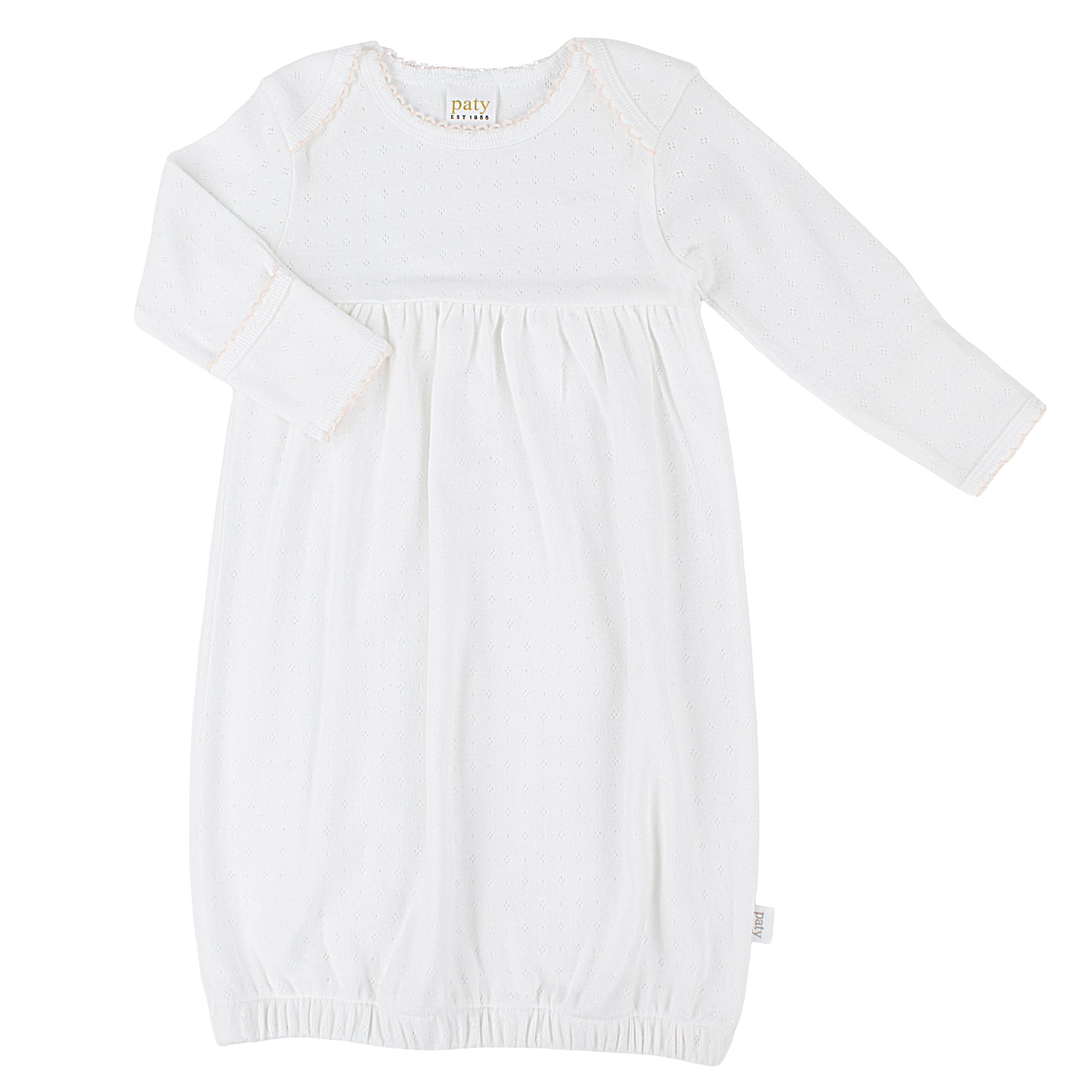 A delicate layette essential for newborns, this baby gown is crafted from soft, breathable organic cotton pointelle fabric, offering a light, airy feel that’s gentle on delicate skin. The subtle pointelle pattern adds a touch of texture and timeless charm, while the overlap shoulders allow for easy dressing. Designed with a softly gathered silhouette and finished with delicate picot trim at the neckline and cuffs, this gown blends comfort with classic detail. The elasticized hem makes diaper changes quick and convenient while keeping baby cozy. Perfect for sleep, lounging, and an ideal baby shower gift or take-home layette essential Product Style #GSS2602.